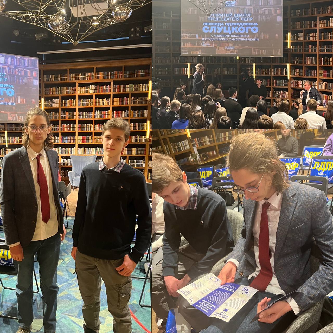 Наши старшеклассники Николай и Александр (члены управляющего совета школы) приняли участие в открытом диалоге с председателем ЛДПР Слуцким Леонидом Эдуардовичем.