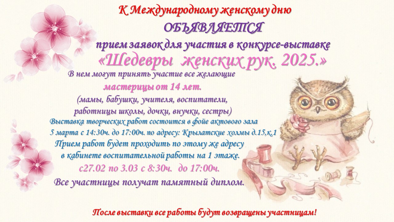 На протяжении 10 лет в нашей школе проходит выставка "Шедевры женских рук", которая откроется и в этом году 5 марта.
