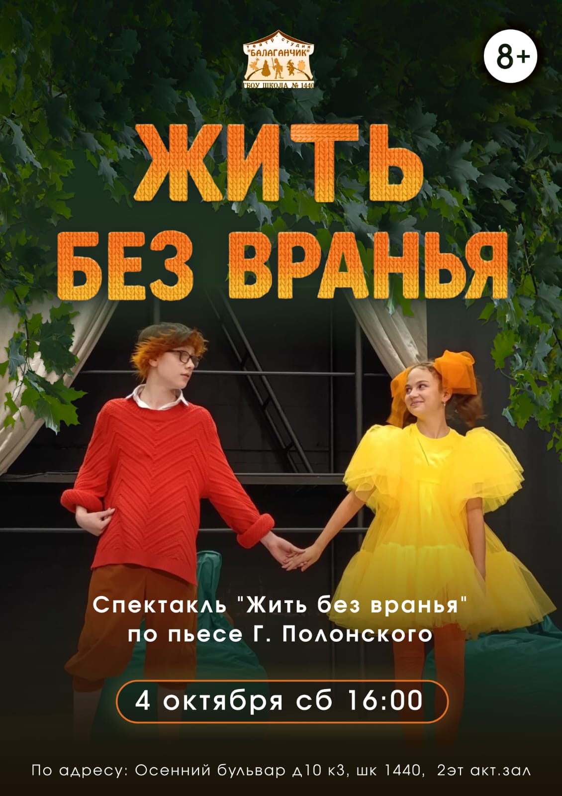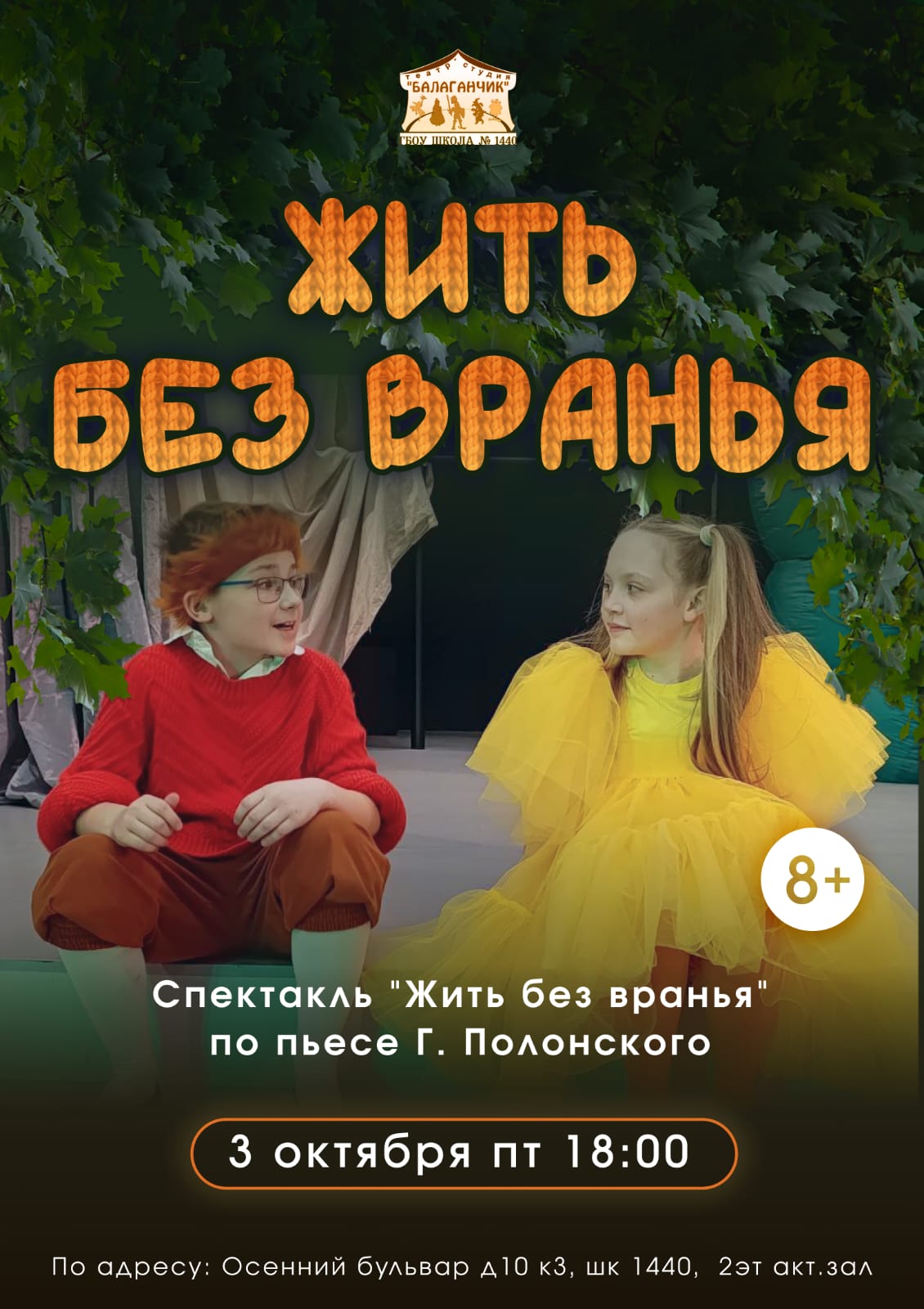 Театральная студия "Балаганчик" открывает 20-ый юбилейный сезон и приглашает на спектакль "Жить без вранья" по пьесе Г. Полонского, где играет старшая группа артистов студии.