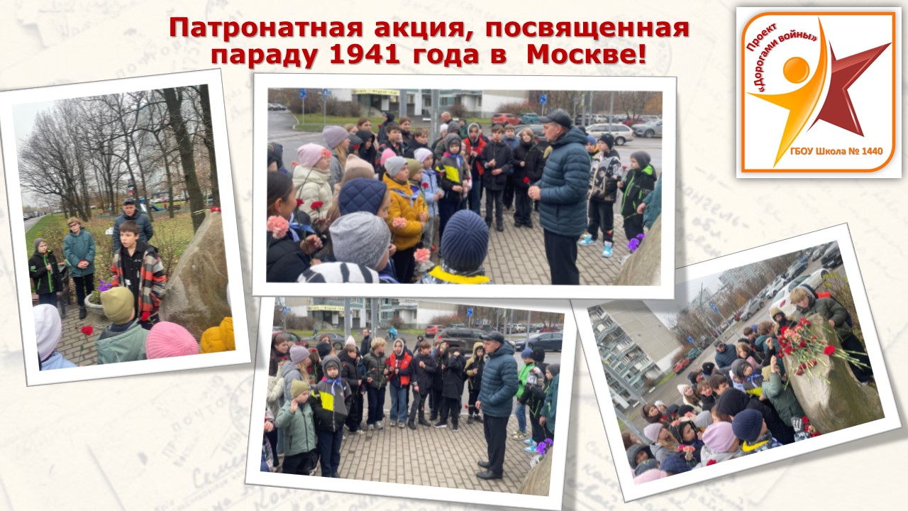 7 ноября 2025 года учащиеся 3 и 6 классов, учителя и родители приняли участие в мемориально-патронатной акции у Памятного камня на Рубежном проезде, посвящённой Дню воинской славы России-военному параду на Красной площади в 1941 году. Шла Московская битва, враг рвался к столице, но парад состоялся, а его участники, пройдя по Красной площади уходили на фронт.
