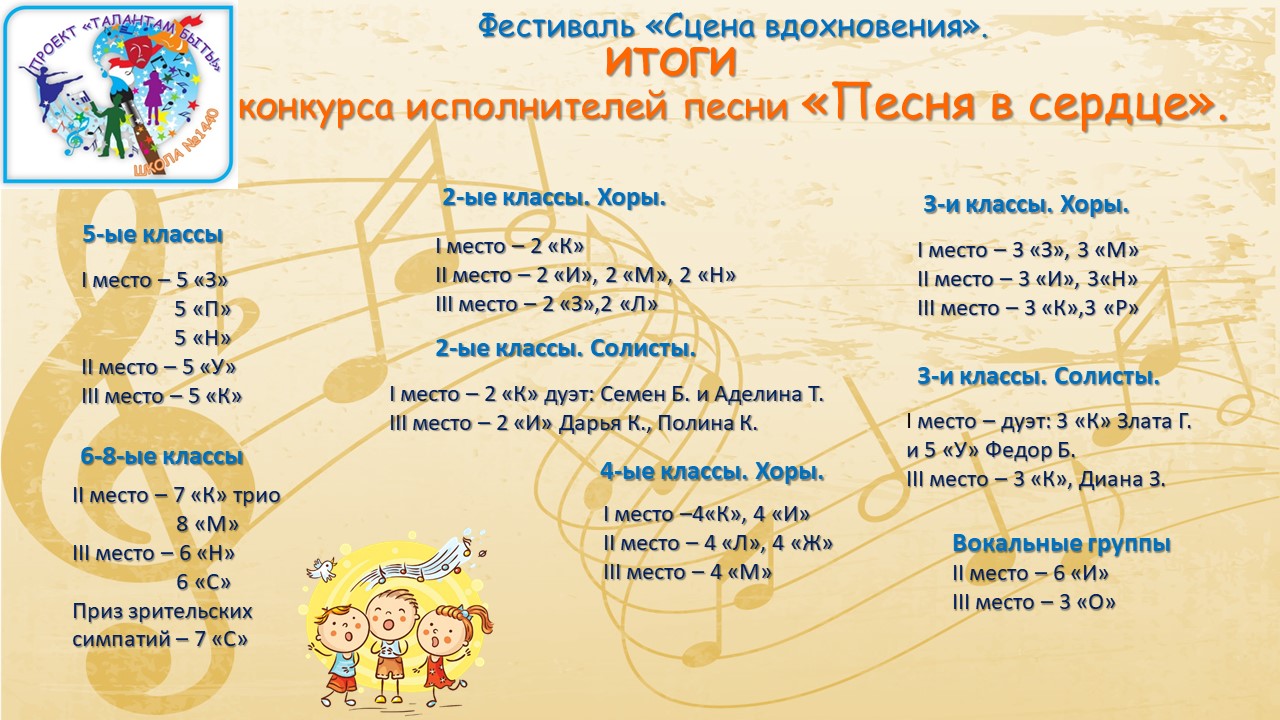 Благодарим классных руководителей, ребят, учителей пения, родителей за настоящий праздник, который состоялся и вдохновил нас всех на новые творческие инициативы! Конкурс песни продемонстрировал, что музыка объединяет поколения, а талант и усердие способны творить чудеса. Впереди — новые творческие свершения и сцены, ждущие своих героев!