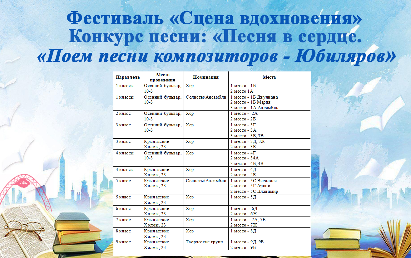 12 декабря во всех наших школьных зданиях состоялся конкурс песни в рамках фестиваля «Сцена вдохновения», посвящённого композиторам‑юбилярам.