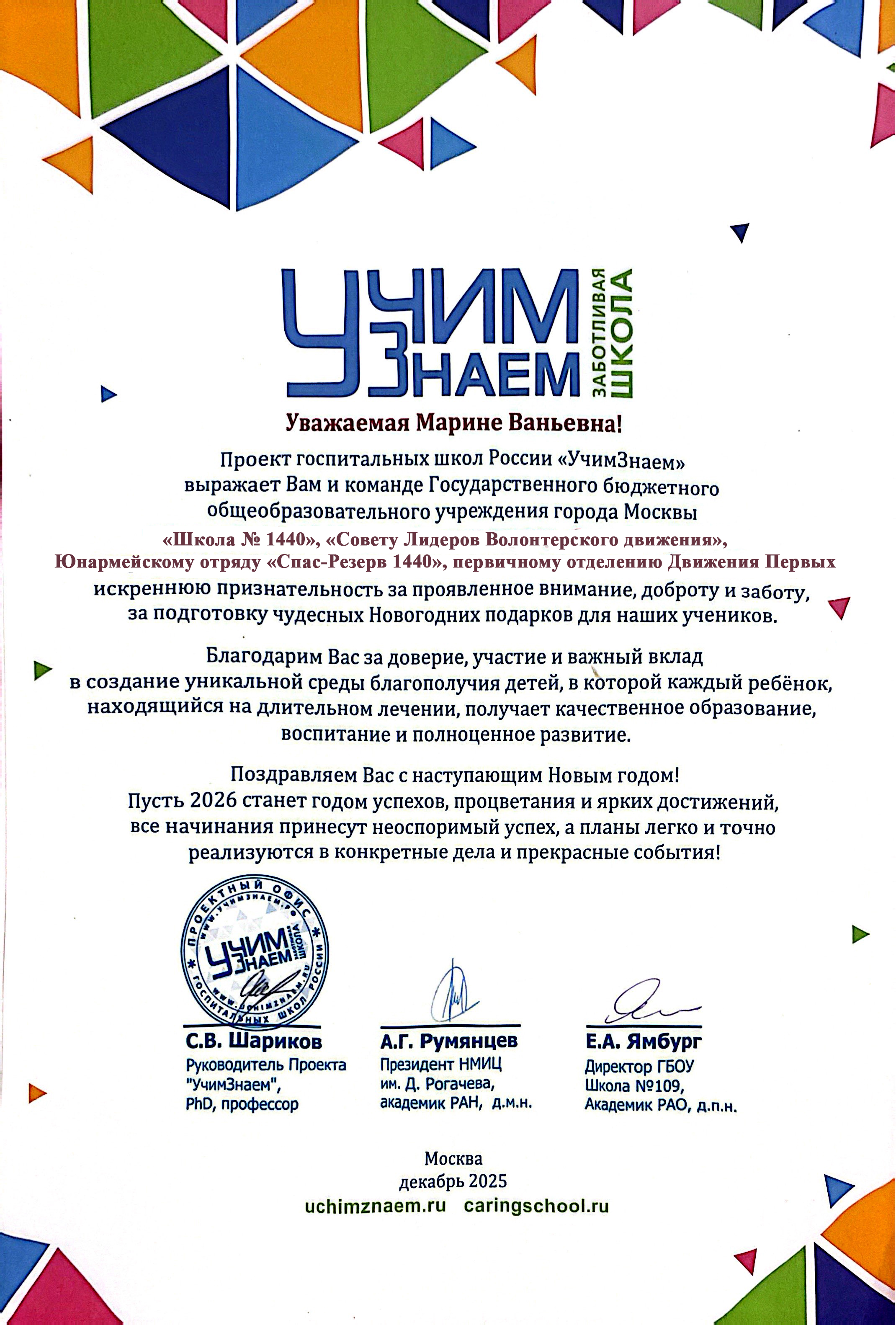 Проект госпитальных школ России «УчимЗнаем» направил директору и педагогическому коллективу нашей школы, Совету лидеров волонтёрского движения, Юнармейскому отряду «Спас‑Резерв 1440» и первичному отделению «Движения Первых» благодарственное письмо за проявленное внимание, доброту и заботу.